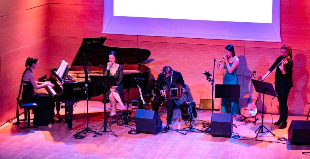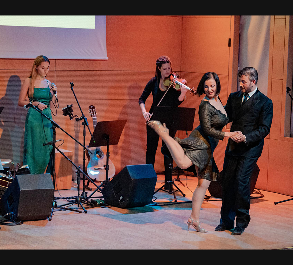 The ensemble aims to promote Tango culture through thematic performances, adaptable to grand theaters as well as intimate settings. These shows feature first-person narratives, brought to life by actress and dancer Mimma Mercurio, recounting the biographies of Tango legends such as Osvaldo Pugliese, Ada Falcón, Roberto Goyeneche, Astor Piazzolla, Azucena Maizani, Juan d’Arienzo, Mercedes Sosa, Carlos Gardel, Eladia Blázquez and others, and they have collaborated on numerous occasions with the Raccontango group, also directed by Mimma Mercurio.